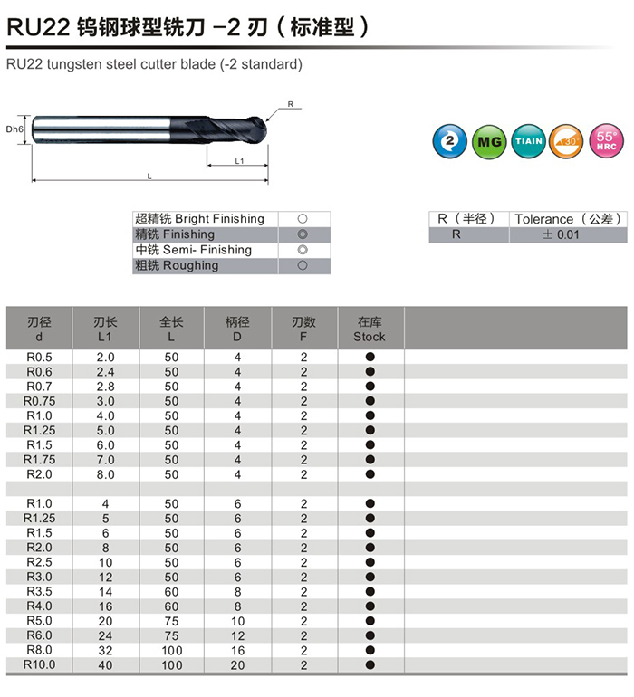 RU22鎢鋼球型銑刀-2刃(標(biāo)準(zhǔn)型)