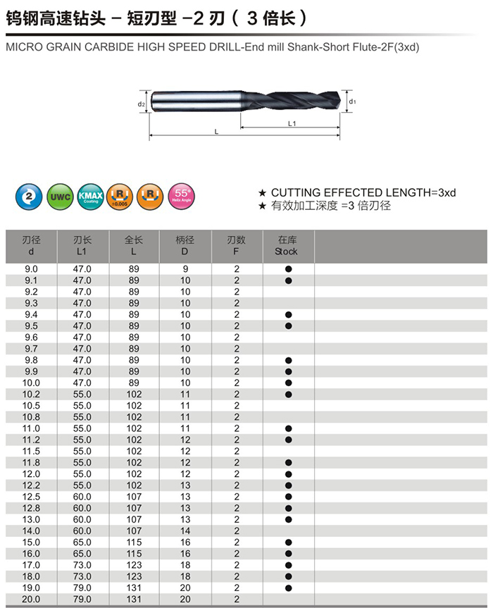 鎢鋼高速鉆頭-短刃型-2刃(3倍長(zhǎng))