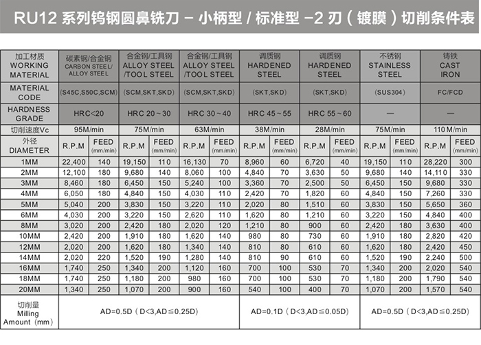 RU12系列鎢鋼圓鼻銑刀-小柄型/標(biāo)準(zhǔn)型-2刃(鍍膜)